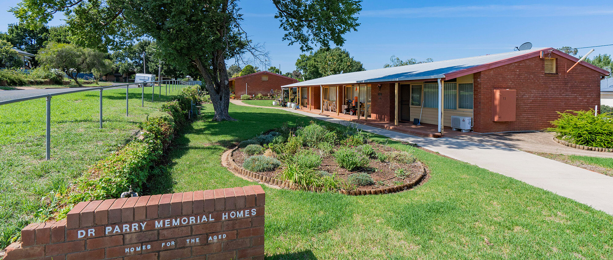 Traditional one bedroom brick units situated in a quiet community setting with established shade trees and well-manicured gardens.